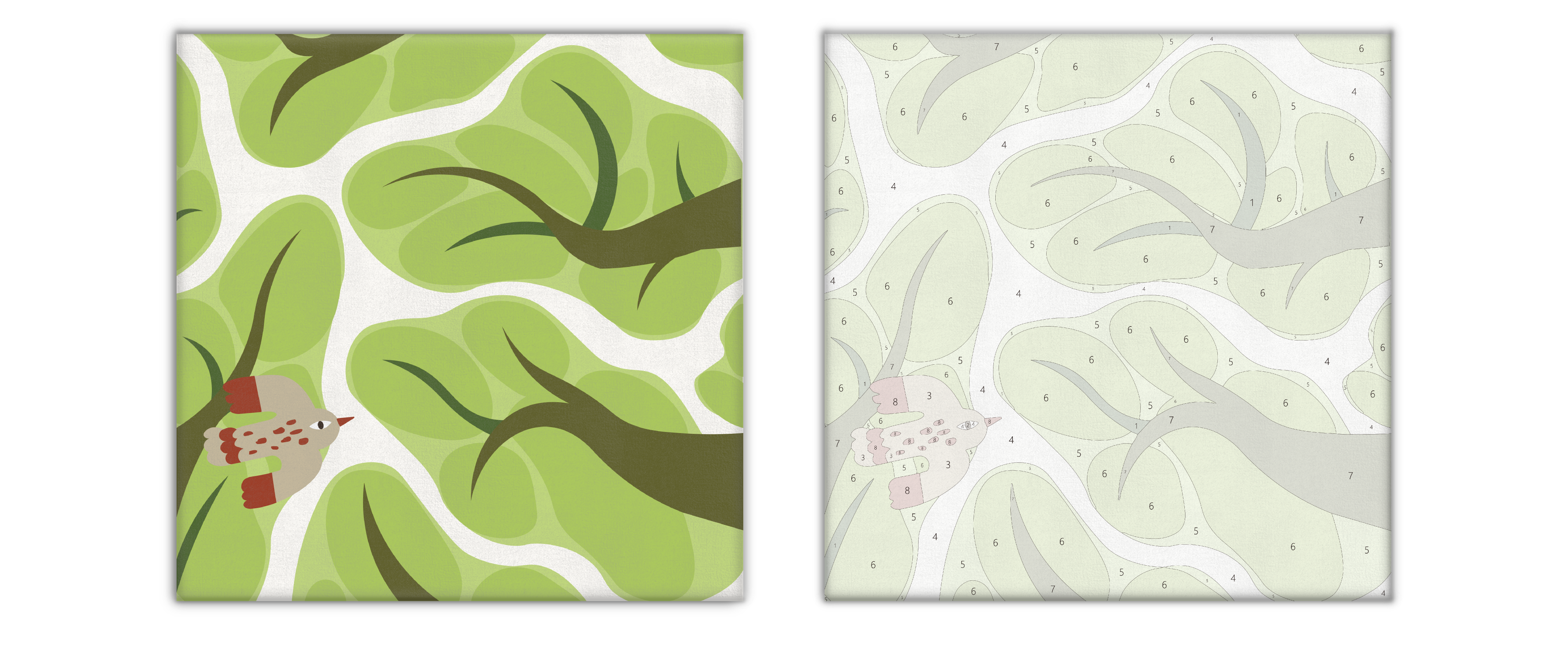 我把樹冠視為一片可流動的地形:用層層半透明的綠塑形葉海,以深色枝條標記方向,再留出潔白的負空間做成“風路”。鳥只是路過,但速度與自由感由此被看見。