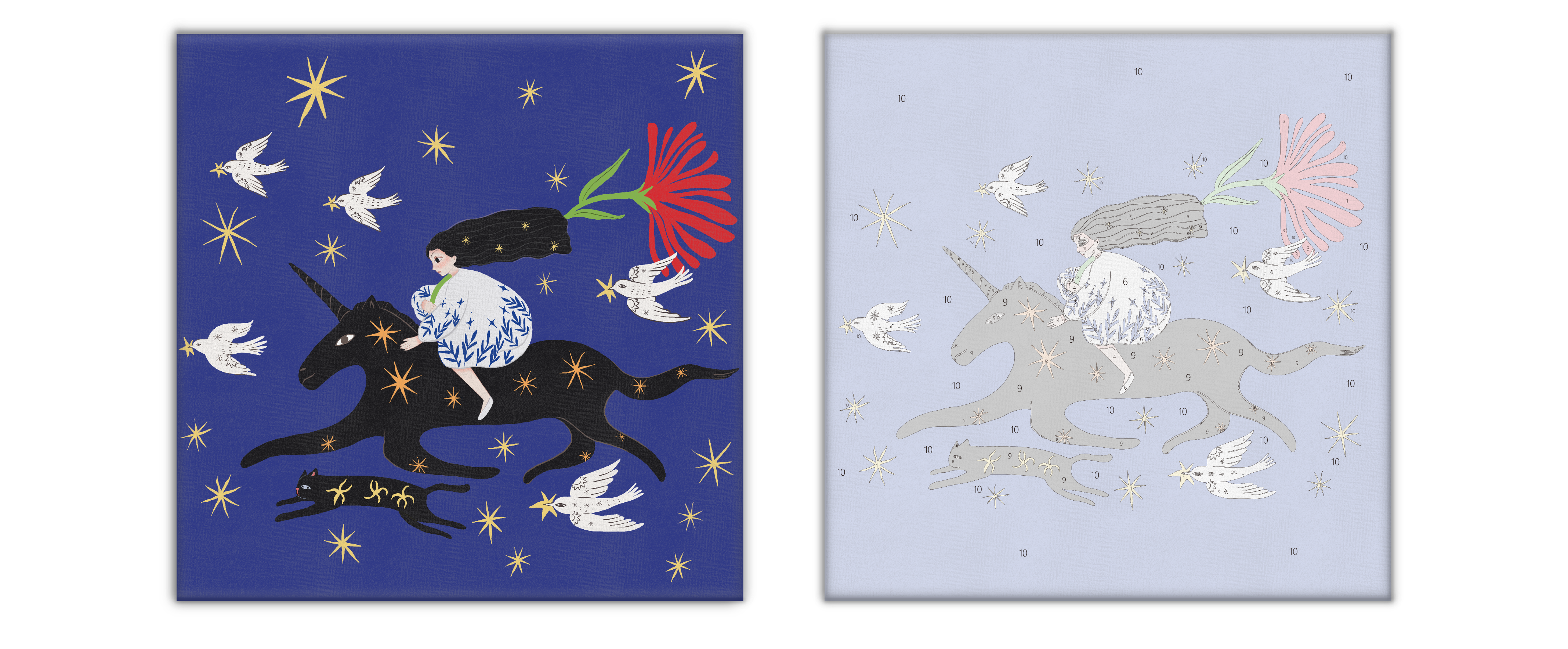 I wanted a gentle kind of speed—not escape, but a run toward someone with a blessing. The unicorn stands for unguarded strength; the doves are messengers of peace; the flower trails like a comet, turning motion into light. This piece is for anyone who keeps moving through the dark.