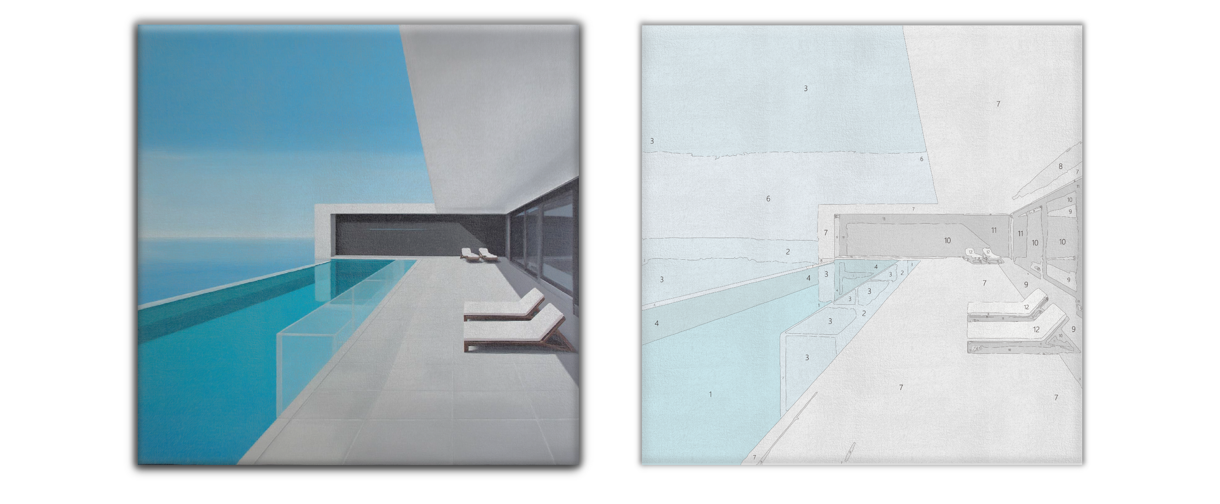 三個平面:天空、海、水池。白色量體切出銳角的影,瓷磚網格把時間拉直。躺椅像一對留白的引號,談休息但語氣很精準。整幅畫把度假轉譯成幾何,冷靜、明亮、克制。