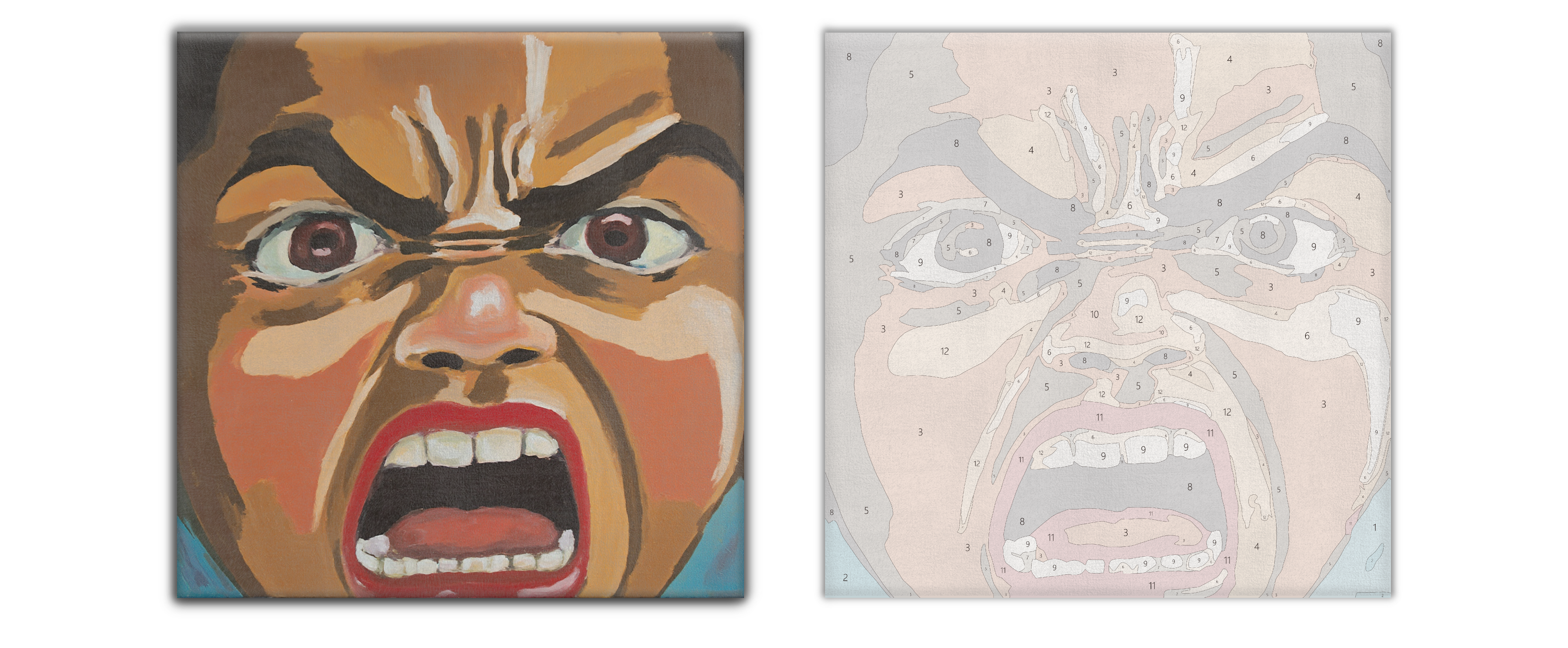 Shot at extreme close range, cry and rage are scaled to near abstraction. A red mouth anchors the frame while the face breaks into clean planes and dense brushwork—a topographic map of feeling. There’s no narrative, only volume.