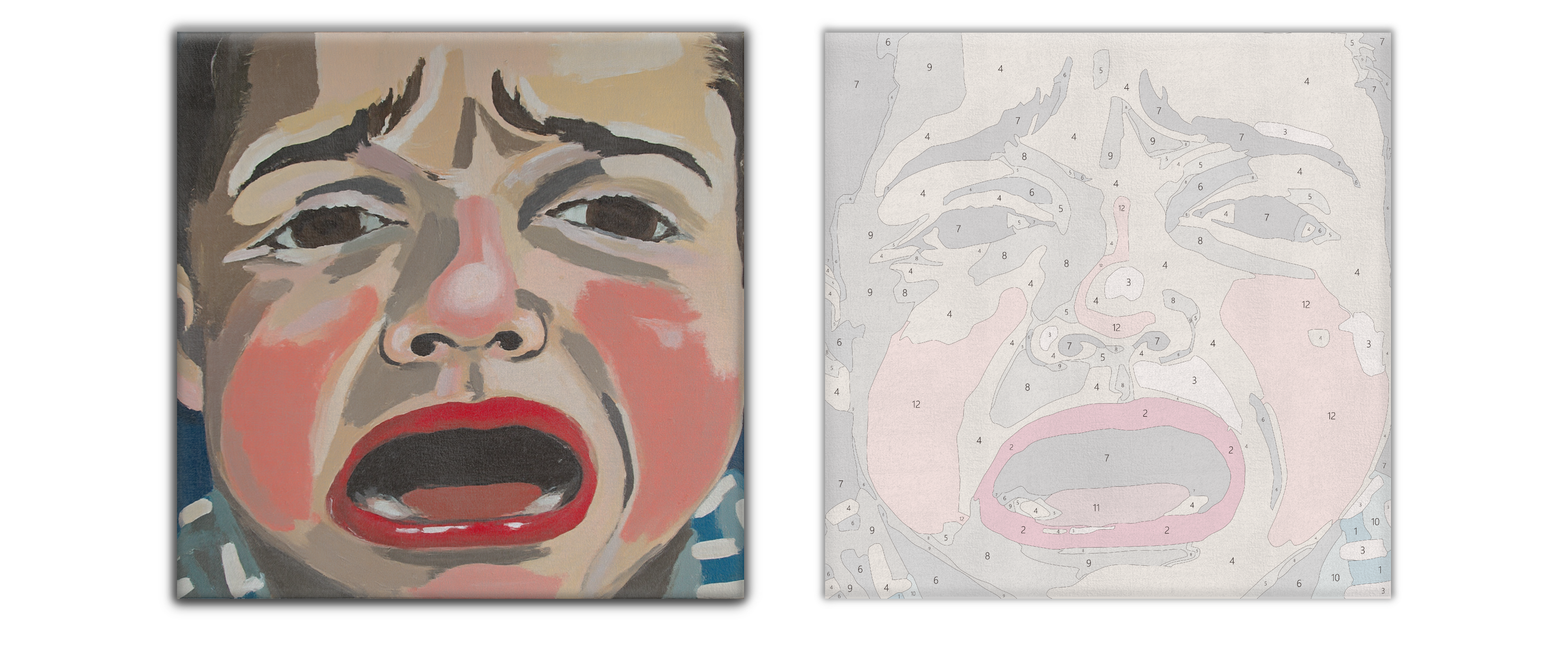 Shot at extreme close range, cry and rage are scaled to near abstraction. A red mouth anchors the frame while the face breaks into clean planes and dense brushwork—a topographic map of feeling. There’s no narrative, only volume.