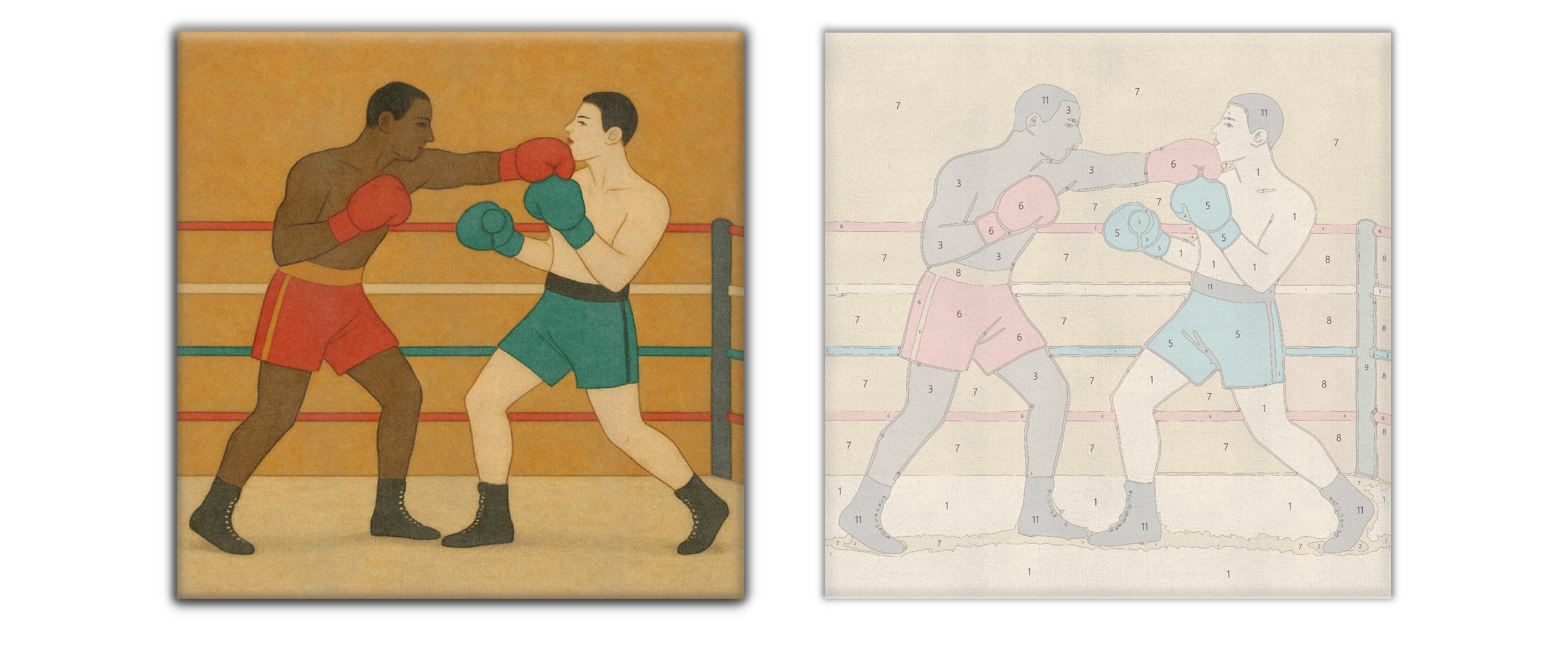 兩名選手以對角線分佈:紅褲前壓出拳,青褲後仰收防。拳套相接形成唯一的焦點,三條繩索給出穩定的水平節奏。底色為暖沙,輪廓線柔和,陰影克制,力量被壓縮在接觸的一點。
