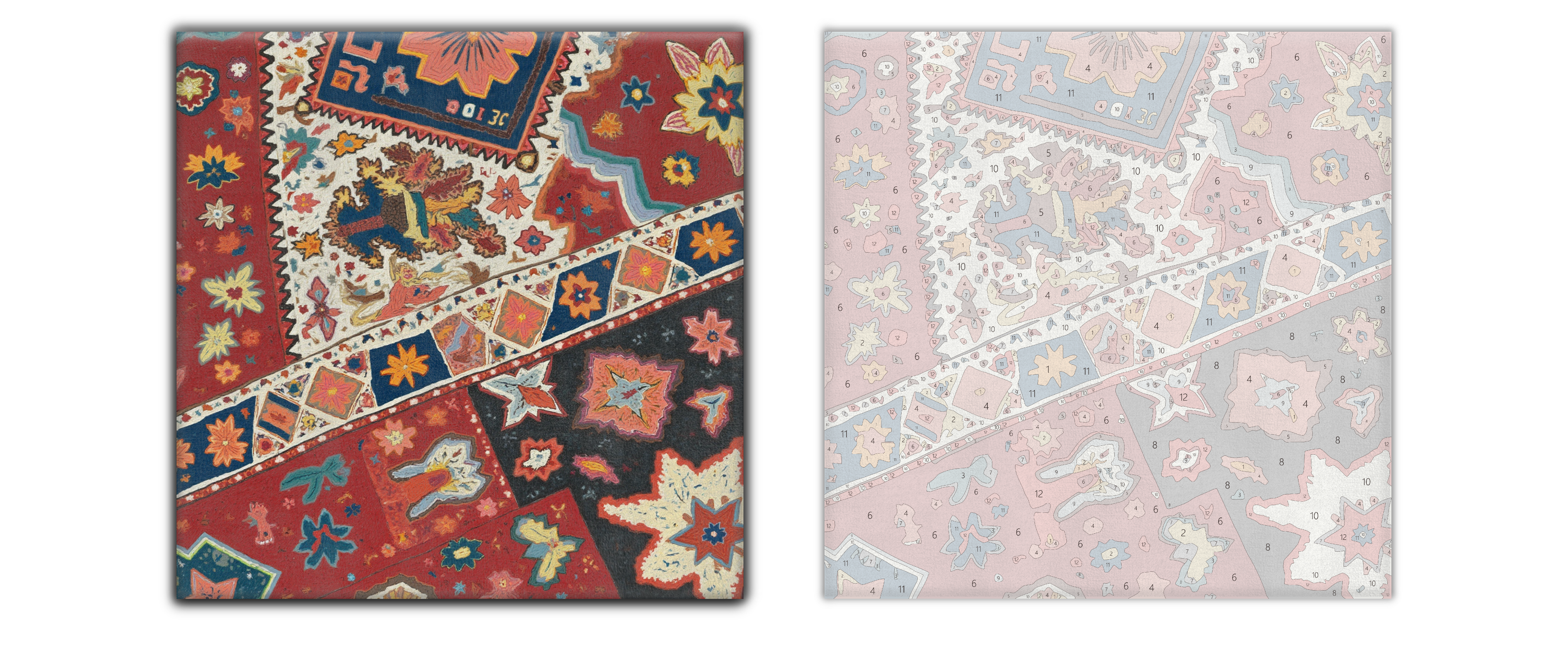 The talk stretches like stale taffy. I look down. The red pattern starts issuing orders: third diamond on the left = nod once; navy star = change half a face; the sawtooth border counts me down. The blooms line up a diagonal, and I follow with my toe—an evacuation by floor plan. Laughter scrapes like plastic; nobody looks up. I reach the door and don’t say goodbye. The dark-blue flower under my heel stamps a silent exit.