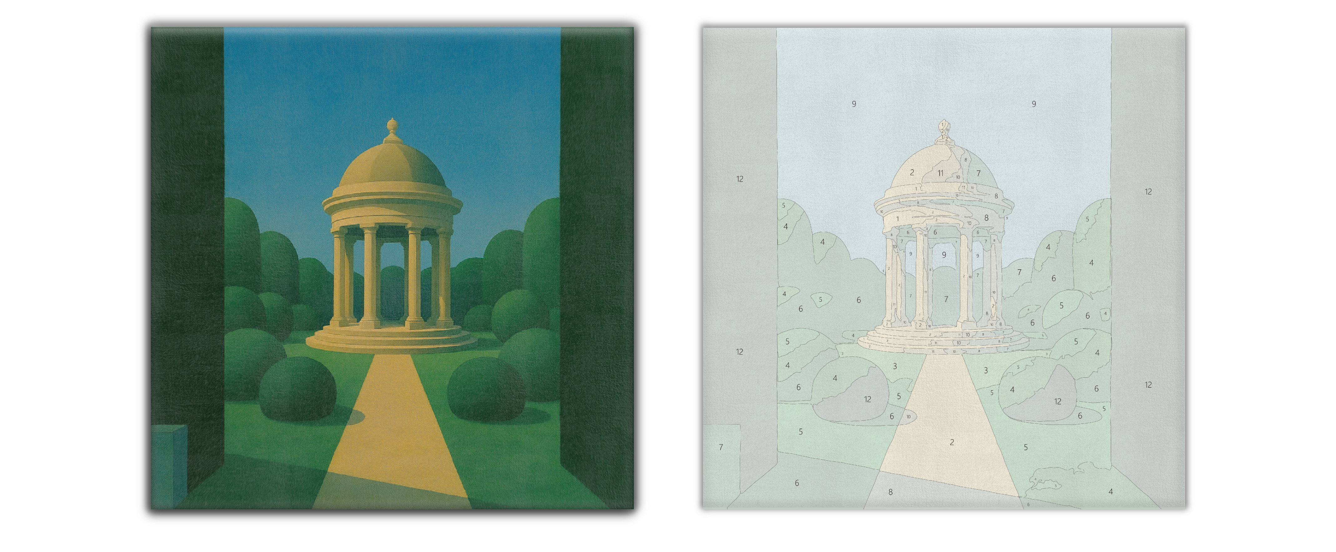 本套組內包含待填色畫板及創作工具組:畫筆、足量顏料、3M牆面磁吸貼對組。將畫面與顏料組上的號碼對照填色,完成後可將磁吸對組黏貼於作品背板與牆面吸附懸掛裝飾您的空間。