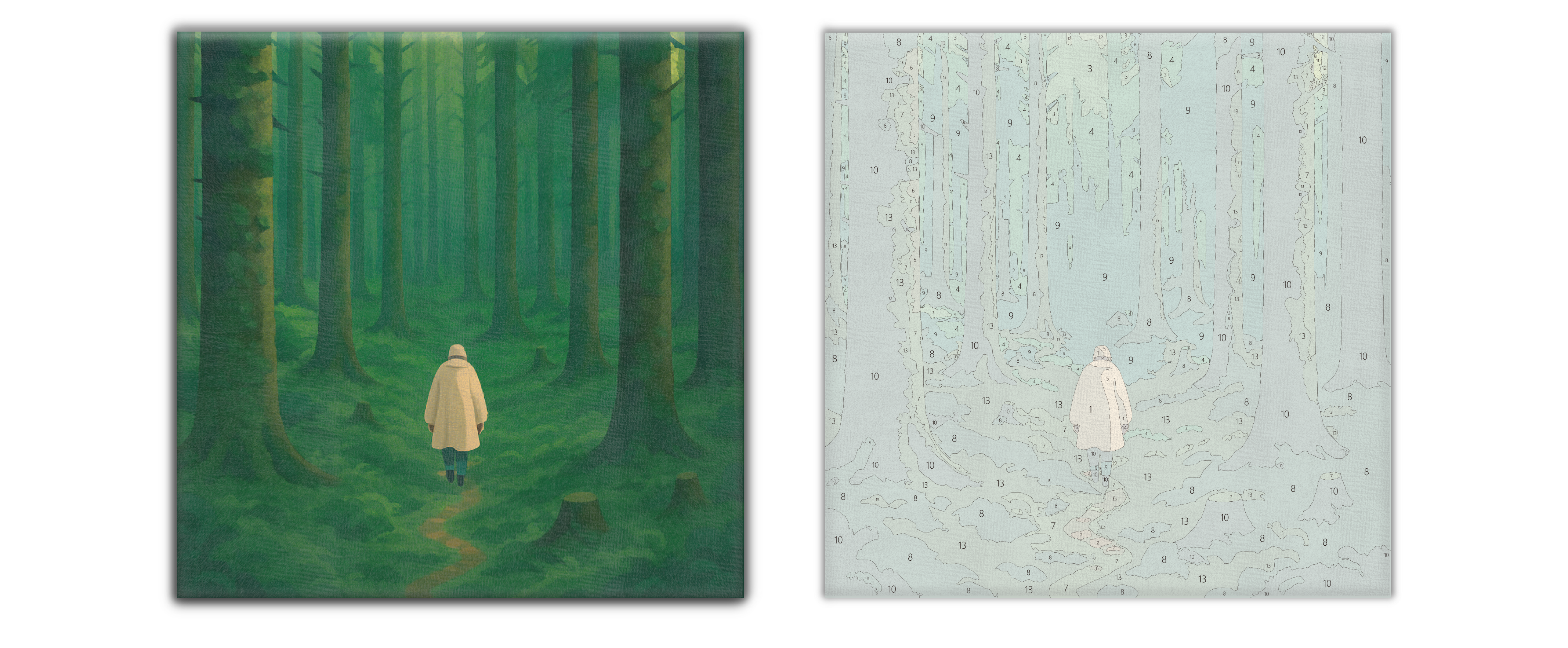 整幅畫幾乎只由綠的層次構成,樹幹以垂直節拍排開;一件淡黃外套成為唯一的異色與視線錨點。小徑以柔和的 S 形向內牽引,節奏由粗到細,像被苔蘚吸音。敘事被降到最低,只留下行走的當下與安靜的間隔。