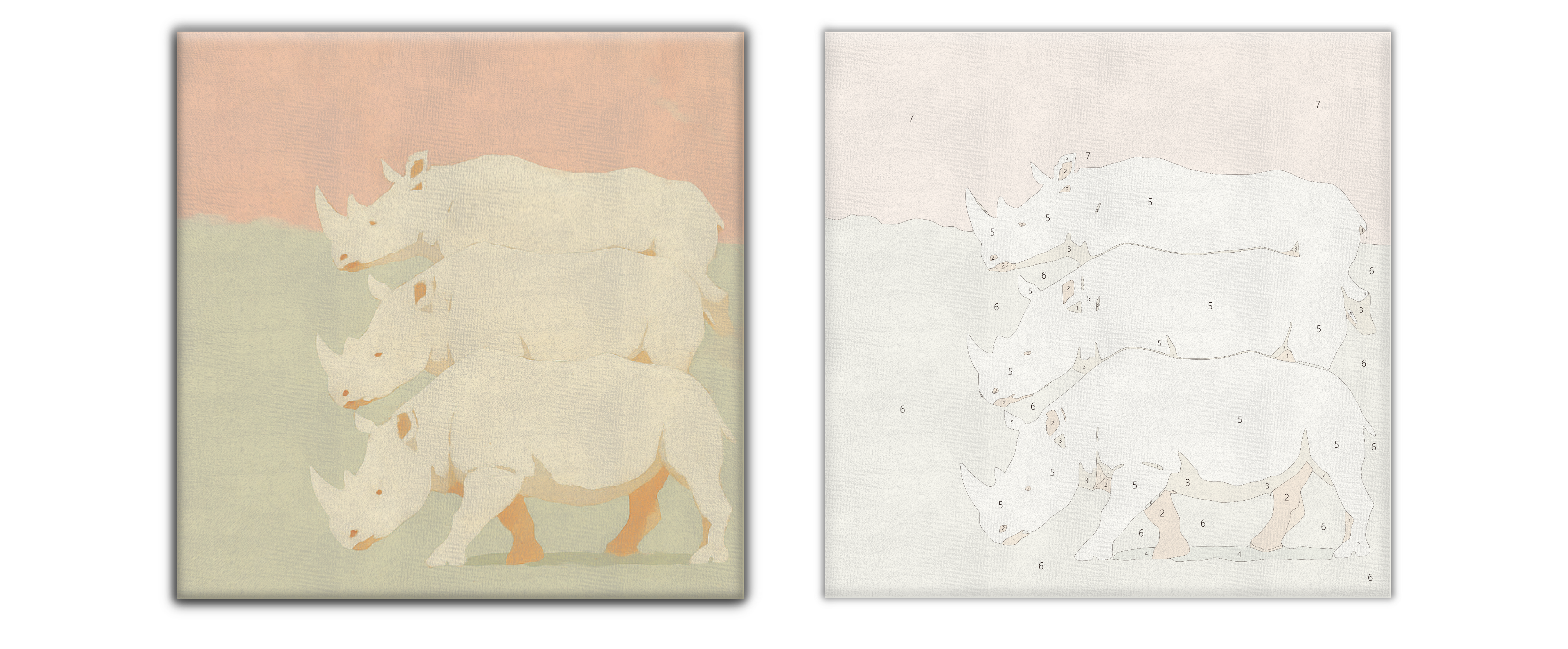 Three white rhinos advance along a diagonal with matching stride—a visible meter. Pastel green and pink flatten ground and sky, turning mass into cadence. Repetition becomes time—before, during, after—three cool echoes. The subject is powerful; the tone is light, with a restrained sense of humor.
