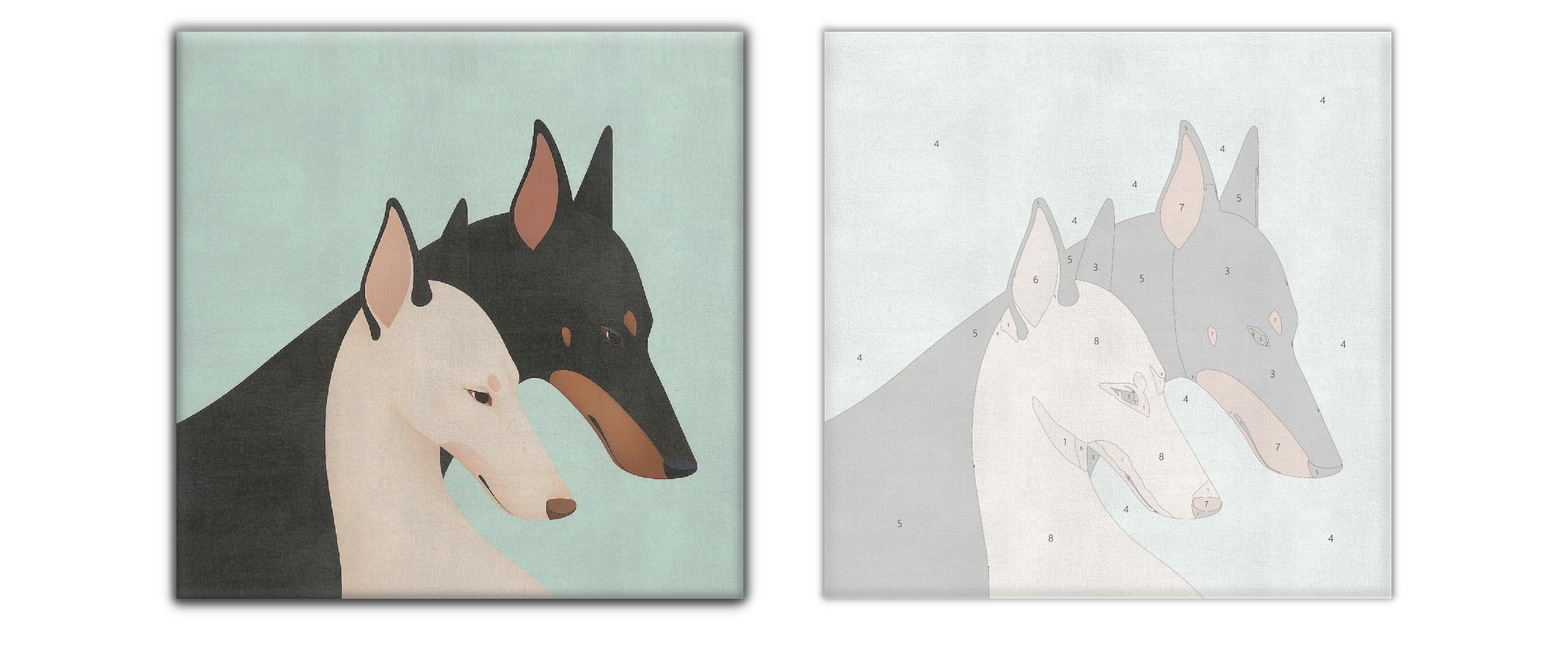 兩個犬的側影互相嵌合,勾出連續的 S 型流線;尖耳在畫面上立起三個節點,穩住節奏。邊緣銳利、明暗過渡極薄,像切紙的淺浮雕,深度被壓到最小以強調輪廓。兩雙眼的視線錯位半拍,在警惕與溫順之間產生張力。作品同時是伴行的肖像與圖形的研究:一個精確的負形與正形練習。