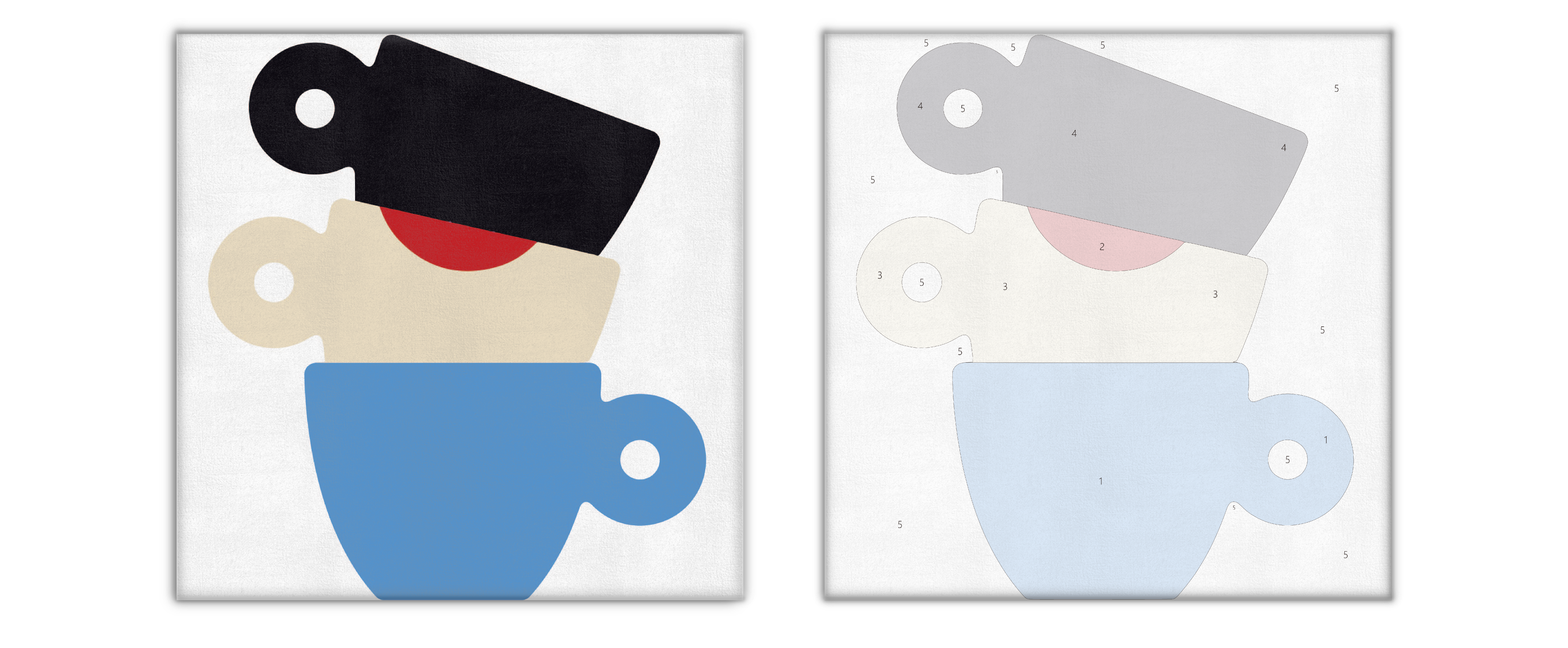 三只杯子被壓縮為幾何與顏色:午夜黑、奶白、天藍,中間一抹紅像醒神的一口。它們以略微失衡的方式堆疊,像一天的節奏——忙碌、喘息、再啟動。留白成了氣息,手把像標點,為日常寫下簡潔的句子。